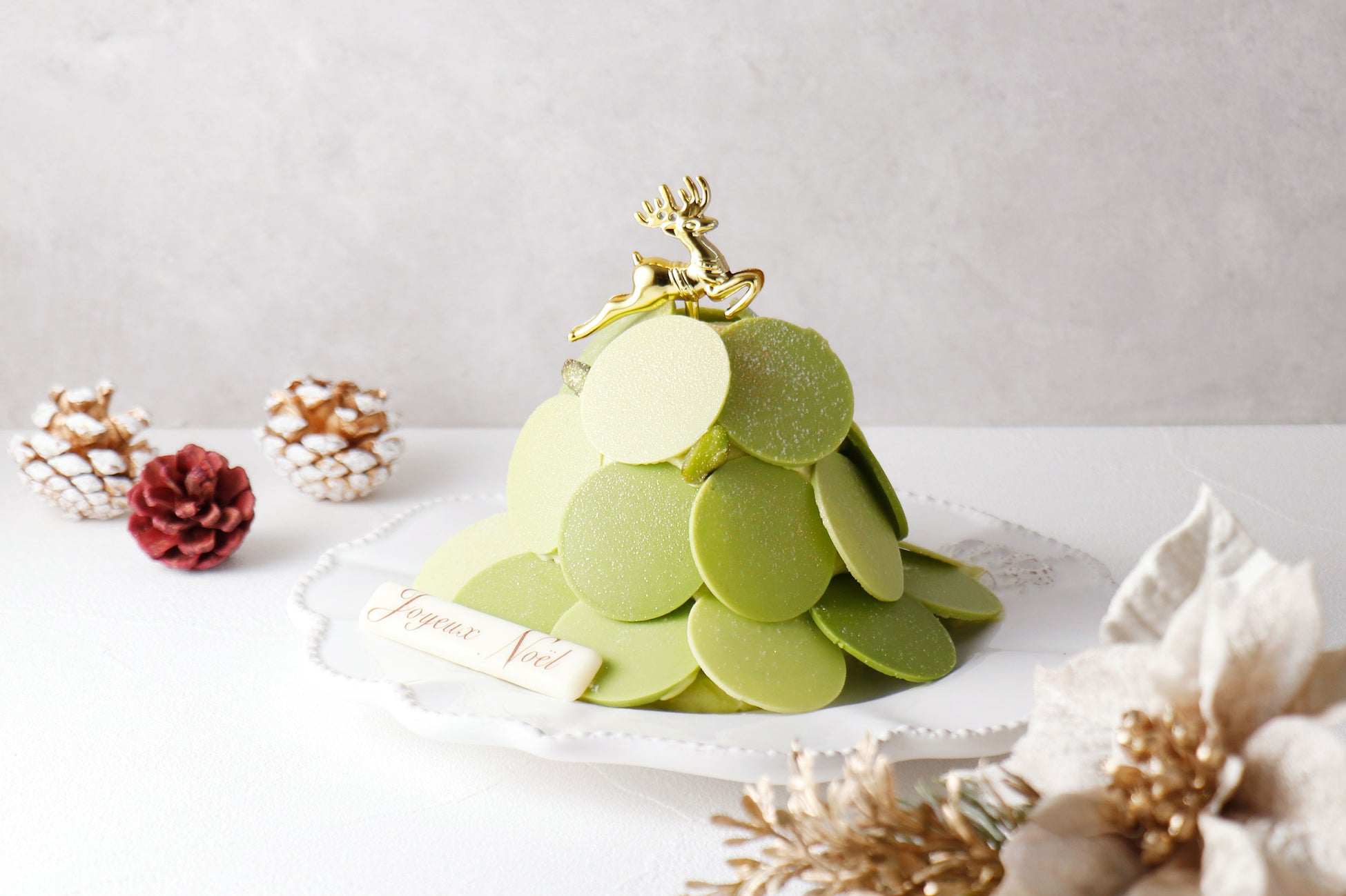 ヘーゼルナッツのプラリネクリームをアクセントに、2種類のピスタチオベースのクリームとピスタチオのビスキュイを何層にも重ね、クリスマスツリーのように仕上げました。