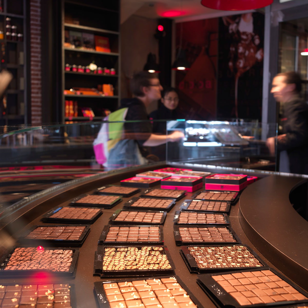 彼のお店では、ファクトリー風のちょっとエッジの効いたスタイルながら、壁面にスクリーン上に流れるチョコレートなど夢のチョコレート工場を再現。