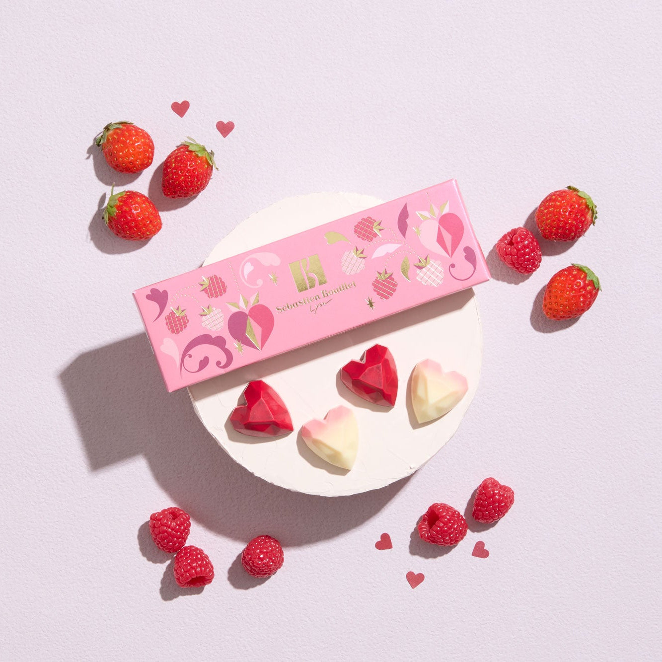 宝石のきらめきを思わせる、ベリーのショコラアソート。フランボワーズガナッシュとストロベリーガナッシュ、2種のガナッシュを艶やかに仕立て、ひと粒ごとに異なるベリーの表情を楽しめます。ジュエリーのような可憐なルックスは、贈りものはもちろん、“思わず撮りたくなる”ショコラです。
