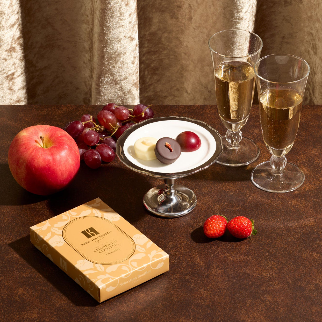 シャンパンとフルーツが溶け合う、カクテルのように華やかな味わいのショコラアソート。香り高いシャンパンガナッシュに、ストロベリー・グレープ・アップルのフルーティなアクセントを重ね、大人の余韻を楽しめるリュクスな仕上がりにしました。ひと粒ごとに広がる果実の香りと気分が華やぐルックスは、ギフトシーンを彩る一品としても注目のショコラギフトです。