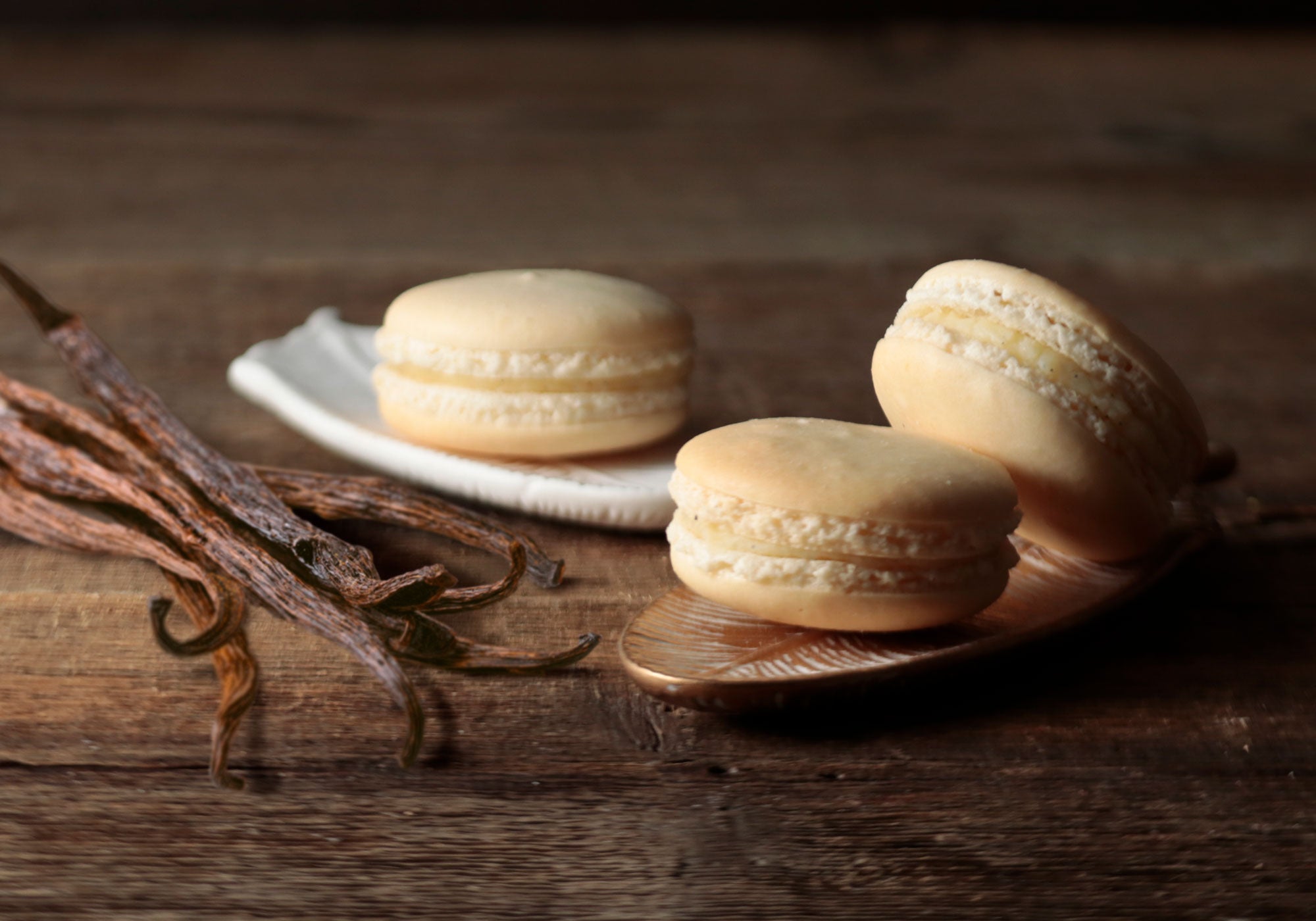 バニラ風味のホワイトチョコガナッシュをサンド。クリーミーな口当たりと程よい甘さで、バニラアイスを食べているような風味を楽しめるマカロン。